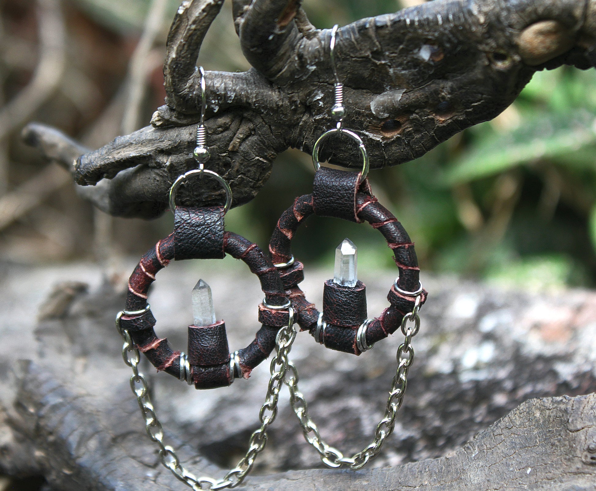 At the base of every hoop hangs a clear, terminated Tibetan quartz point—ancient, luminous, and powerfully amplifying—nestled in a leather-bound cradle and anchored with stainless steel rings. Fine stainless steel chains cascade below, swaying like ritual pendulums with every movement.