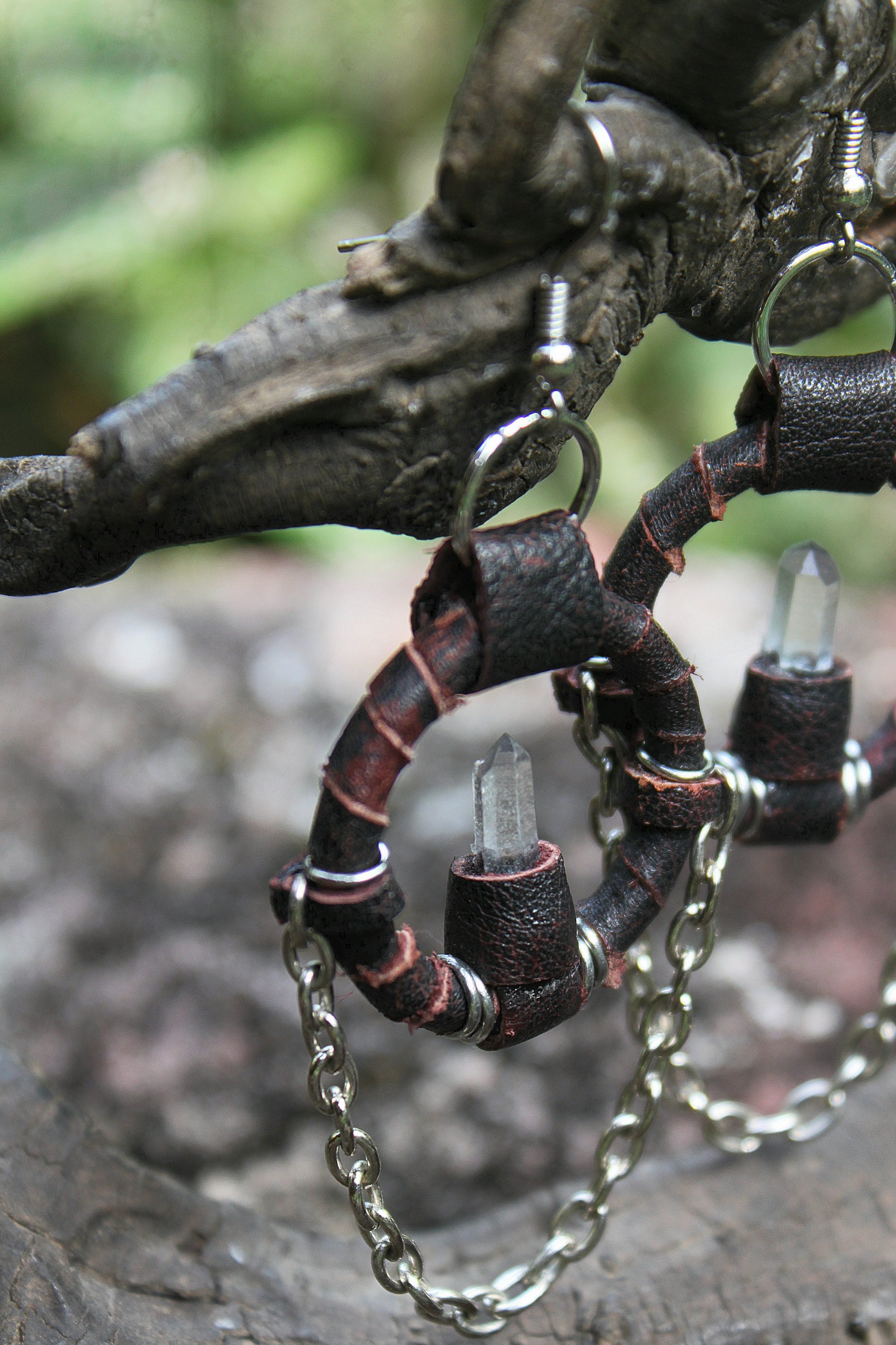 - Materials: repurposed brown leather, Tibetan quartz crystals, stainless steel